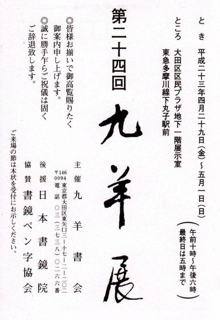 関連団体である九羊書会主催の展覧会が開催されます。日時 平成23年4月29日(金)~5月1日(日) 午前10時~午後6時 最終日は5時まで場所 大田区民プラザ地下1階展示室5月3日からは 日本書鏡院選抜展が「銀座鳩居堂画廊」において5月8日まで開催!!どちらも お誘い合わせのうえ御高覧くださいませ。