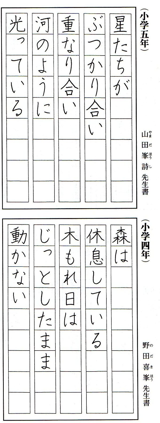 小五・小四の課題五年・四年とも「星・重・息・動」と横画が多いです。間隔に気をつける字の勉強にしましょう!