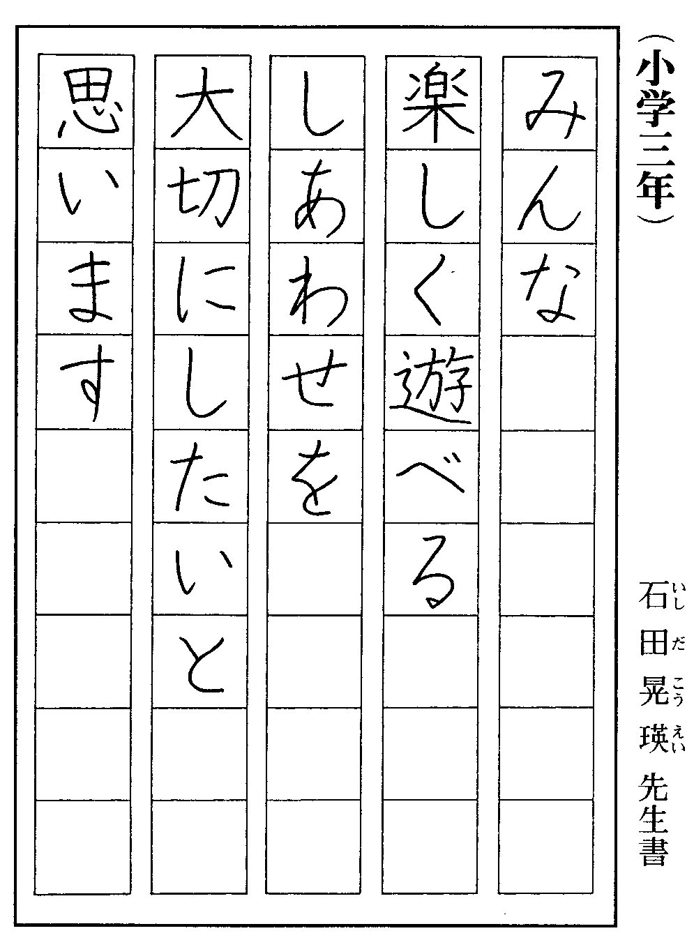 今月は、基本講座(2)・筆ペン講座・小学3年のお手本のご紹介です。