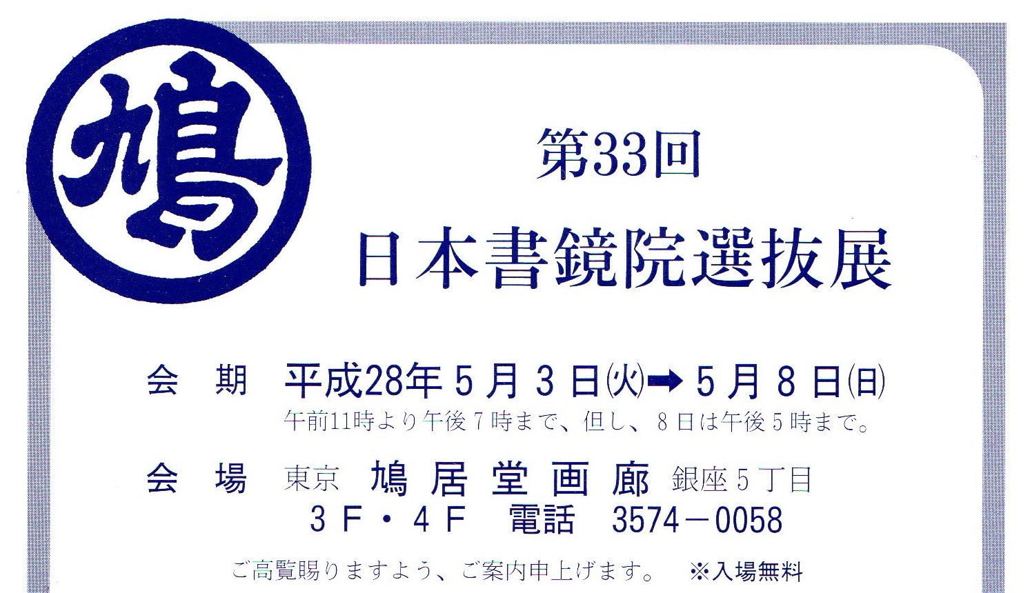5月3日~5月8日の会期で、銀座鳩居堂にて関連団体の日本書鏡院選抜展が開催さます。当協会からも 大木会長はじめ、多数の先生方が出品しています。ゴールデンウィーク中の開催となりました。是非、お立ち寄り下さいますようご案内申し上げます。
